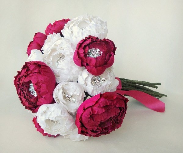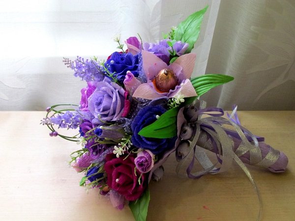Из искусственных материалов изготавливают шикарные букеты, которые смотрятся не менее роскошно, нежели атрибут на основе живых растений. Главное – тщательно продумать дизайн и элементы декора.
